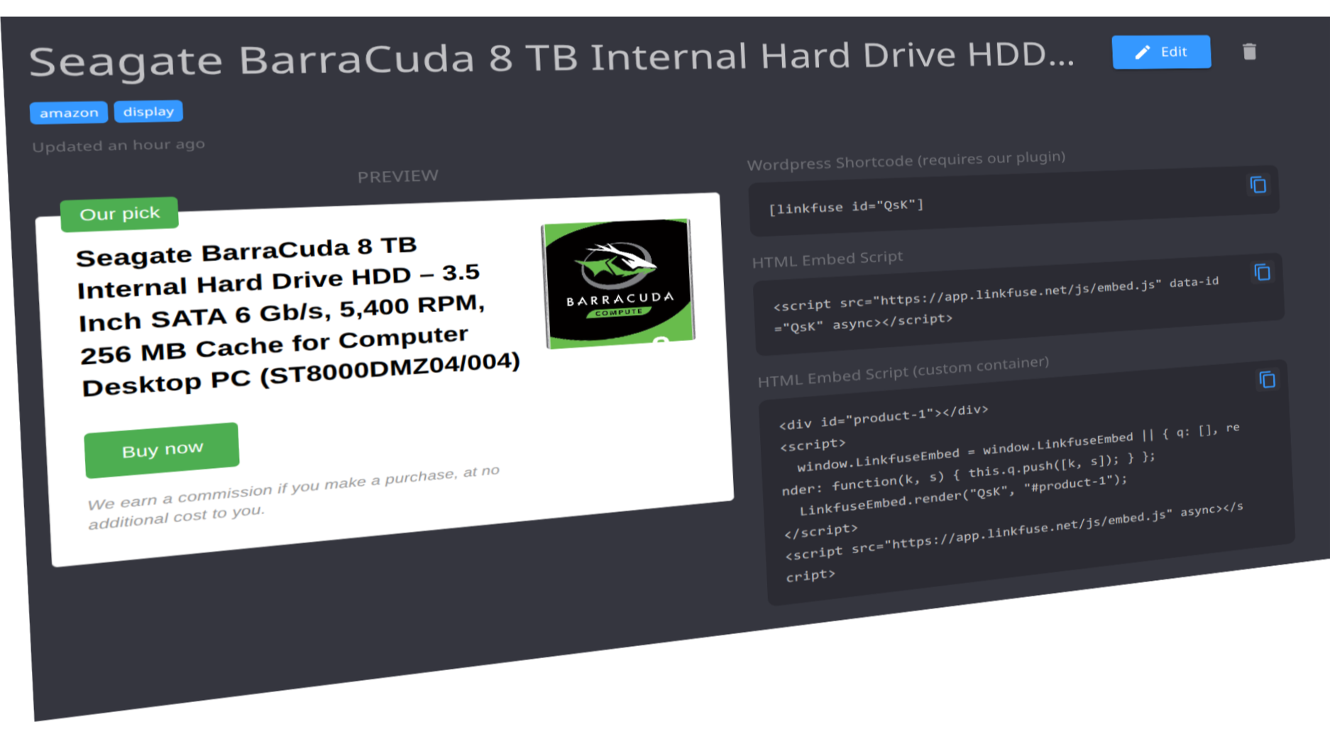 You've written the perfect product review. Your content is helpful, honest, and exactly what your readers need. But when it comes to actually showing the product? You're stuck with a plain text link that looks like an afterthought—or worse, a clunky Amazon widget that clashes with your site's design. If you've ever wished you could present affiliate products with the same polish as major retail sites, Linkfuse's new Product Displays feature is built for you.